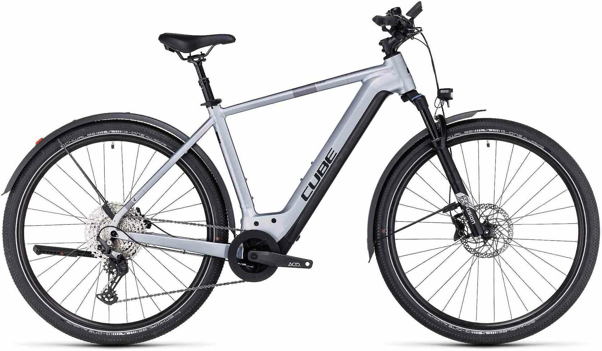 Kompromisse sind nicht so unser Ding hier bei CUBE. Deshalb haben wir das Nuride Hybrid EXC Allroad auch ausschließlich mit extrem zuverlässigen Komponenten bestückt. Eine davon ist der Bosch CX Antrieb der vierten Generation, zwei weitere die Deore 12-fach Schaltung und die leistungsstarken hydraulischen Scheibenbremsen von Shimano. Und weil auf Abenteuertour auch der Fahrkomfort nicht zu kurz kommen darf, haben wir dem Bike griffige Schwalbe Reifen und eine geschmeidig arbeitende Gabel mit 100 mm Federweg spendiert. Übrigens, hier kannst du aus verschiedenen Rahmenformen auswählen – der Tiefeinstieger hat sogar einen verstellbaren Vorbau – und findest garantiert die richtige Passform für dich. Superpraktisch zudem: das umfangreiche Zubehör, bestehend aus Schutzblechen, Lichtern und Seitenständer.