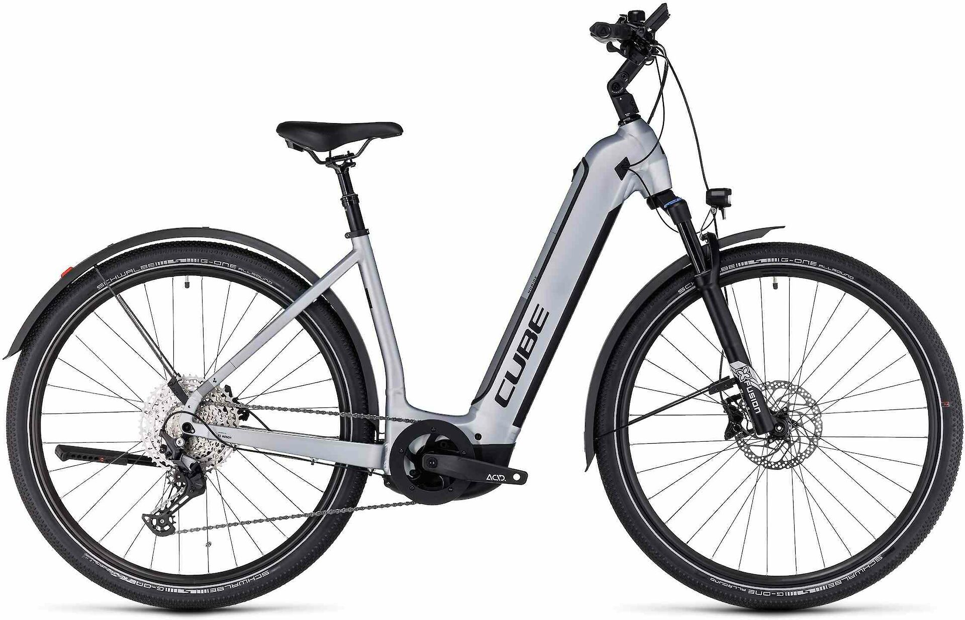 Kompromisse sind nicht so unser Ding hier bei CUBE. Deshalb haben wir das Nuride Hybrid EXC Allroad auch ausschließlich mit extrem zuverlässigen Komponenten bestückt. Eine davon ist der Bosch CX Antrieb der vierten Generation, zwei weitere die Deore 12-fach Schaltung und die leistungsstarken hydraulischen Scheibenbremsen von Shimano. Und weil auf Abenteuertour auch der Fahrkomfort nicht zu kurz kommen darf, haben wir dem Bike griffige Schwalbe Reifen und eine geschmeidig arbeitende Gabel mit 100 mm Federweg spendiert. Übrigens, hier kannst du aus verschiedenen Rahmenformen auswählen – der Tiefeinstieger hat sogar einen verstellbaren Vorbau – und findest garantiert die richtige Passform für dich. Superpraktisch zudem: das umfangreiche Zubehör, bestehend aus Schutzblechen, Lichtern und Seitenständer.